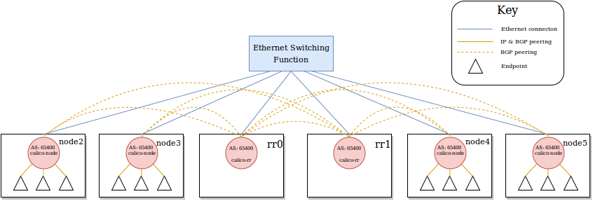 The inventory above will deploy the following topology assuming that calico's global_as_num is set to 65400: